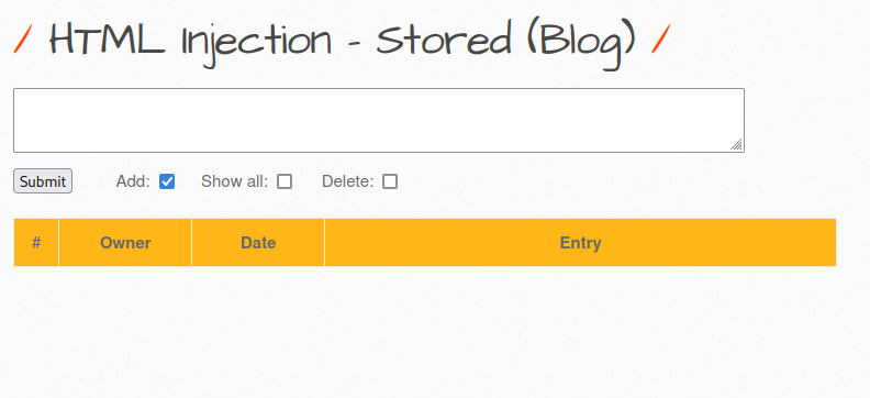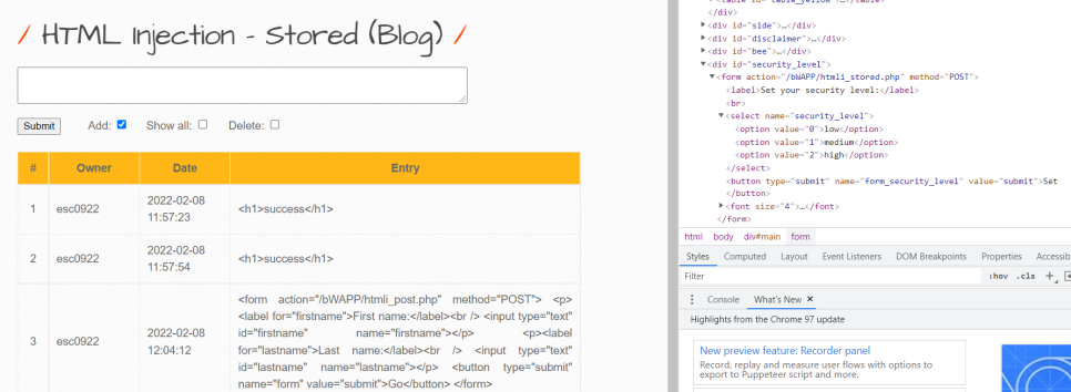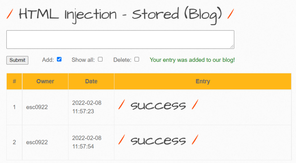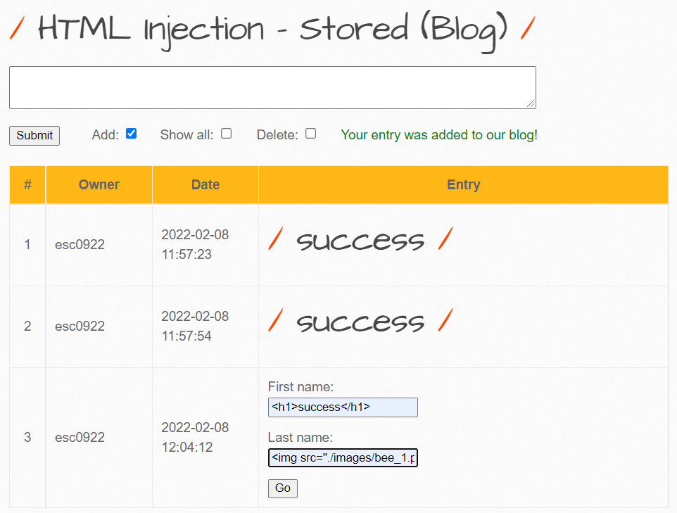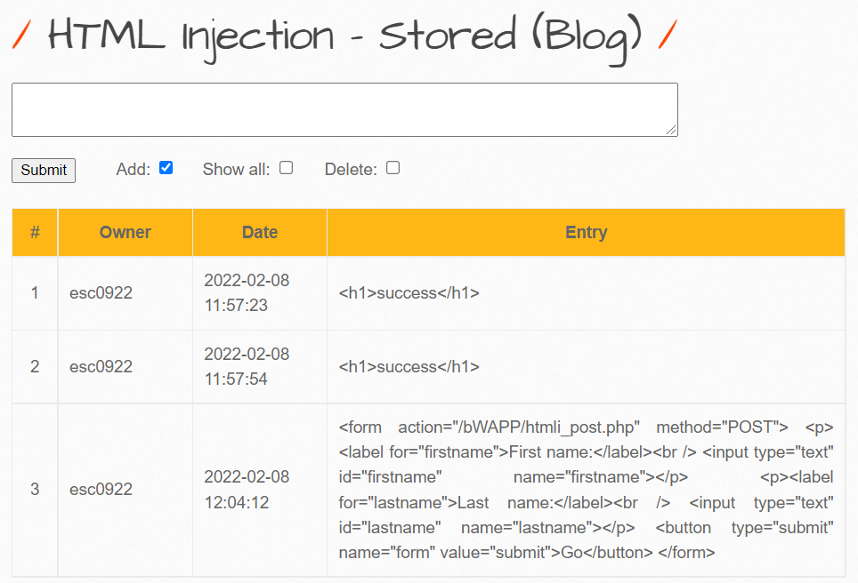 [bWAPP] HTML Injection – stored (Blog) 본문