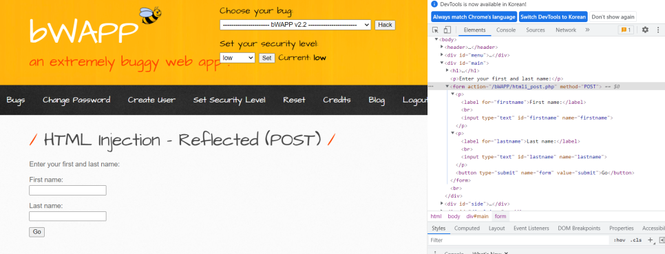개발자도구를 이용해서 Reflected(post)의 form 코드를 확인했다.