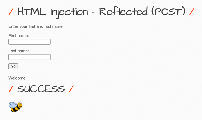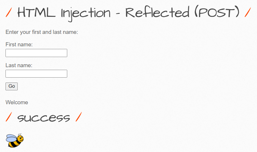 <form action="/bWAPP/htmli_post.php" method="POST"> <p><label for="firstname">First name:</label><br /> <input type="text" id="firstname" name="firstname"></p> <p><label for="lastname">Last name:</label><br /> <input type="text" id="lastname" name="lastname"></p> <button type="submit" name="form" value="submit">Go</button> </form>