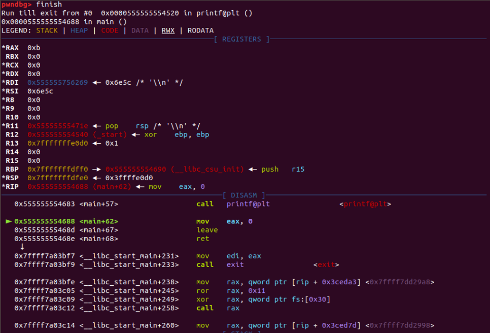 printf 함수 바로 다음으로 이동한 것을 확인할 수 있다.