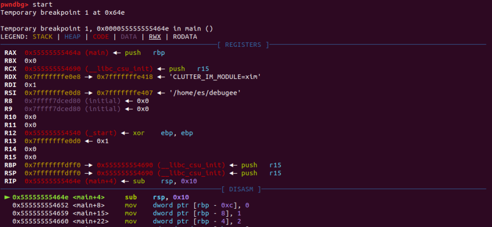 start 명령어를 이용해서 실행시켜보면 예상했던 것(breakpoint가 0x400400에 걸릴 것이다)와는 다르게 시작점이 0x55555555464e인 것을 확인할 수 있다. 왜 다를까?