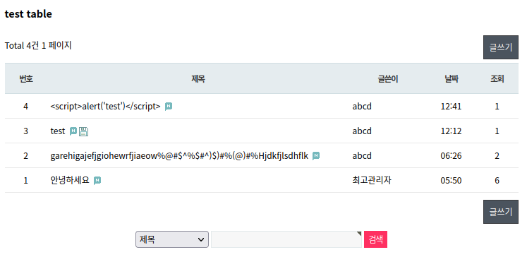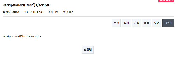 xss 취약점이 존재하는지 확인하기 위해 'test'를 출력하는 경고창을 내보내는 스크립트를 삽입했다.