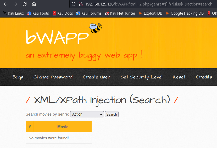난이도 high에서는 genre 변수에 XML 인젝션에 사용되는 문자를 넣어도 결과가 나오지 않는다.