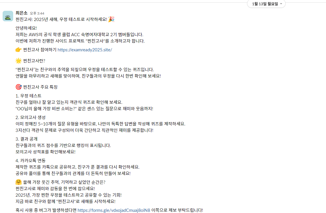 2024년 11월부터 2025년 1월까지 사이드 프로젝트로 우정 테스트 퀴즈, 찐친고사를 제작하고 배포했습니다.