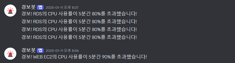 비용 상의 문제로 프로메테우스는 사용하지 못했지만, Cloudwatch와 CloudTrail을 이용해 콘솔에서 리소스 추적을 진행하고, 디스코드 봇을 이용해서 CPU 사용률에 따라 경보가 오도록 설정했습니다.