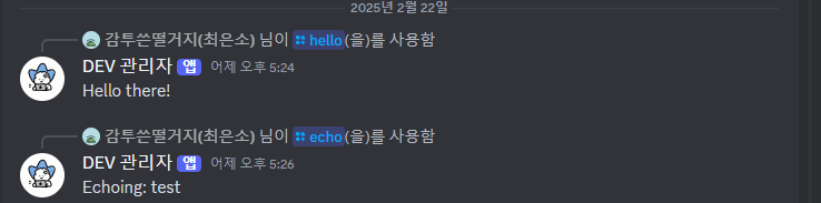 hello 명령어와 echo 명령어를 설정했습니다.