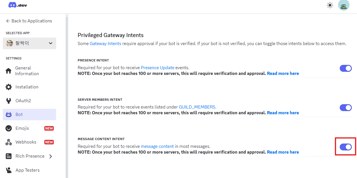 좌측 메뉴에서 "Bot"을 클릭하고, MESSAGE CONTENT INTENT를 활성화합니다.