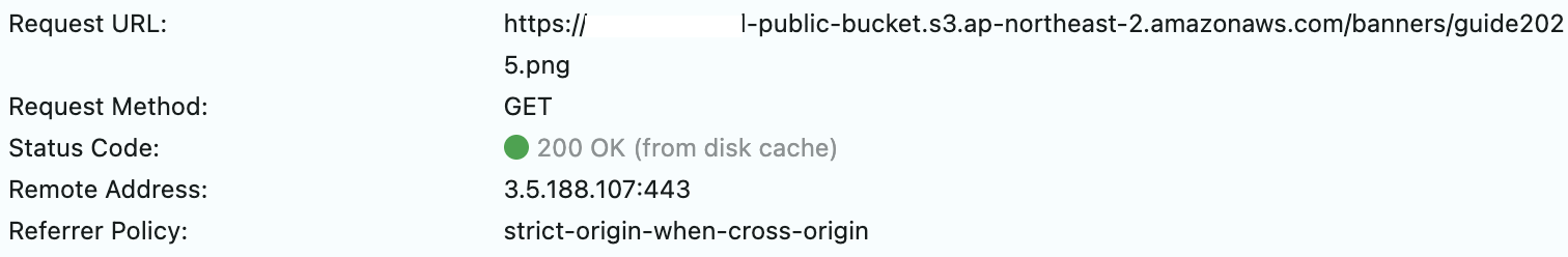 그래서 실제로 퍼블릭 URL을 만들어서 요청을 보내면 개발자 도구에서 다음과 같이 버킷 이름, 경로, 파일이름 등이 전부 노출되는 것을 확인할 수 있다.