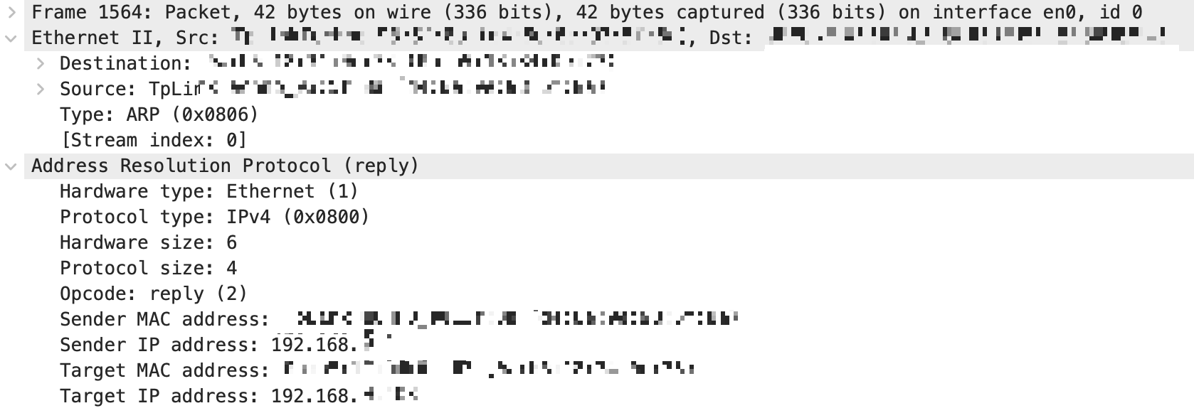 Destination은 요청 패킷을 보낸 Source, Type은 ARP(0x0806), 응답이기 때문에 Opcode는 reply(2)이라는 것을 확인할 수 있다.