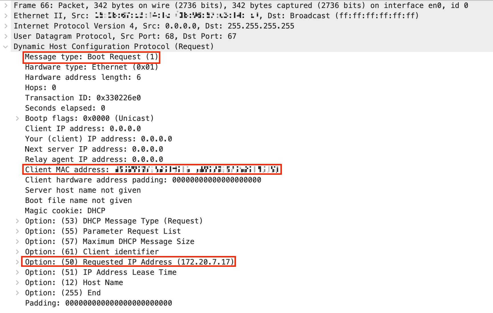 해당 패킷을 통해 MAC 주소가 XX:XX:XX:XX:XX:XX인 장치가 이전에 사용했던 IP 172.20.7.17을 계속 사용하기 위해 DHCP Request를 보냈다는 것을 알 수 있다.