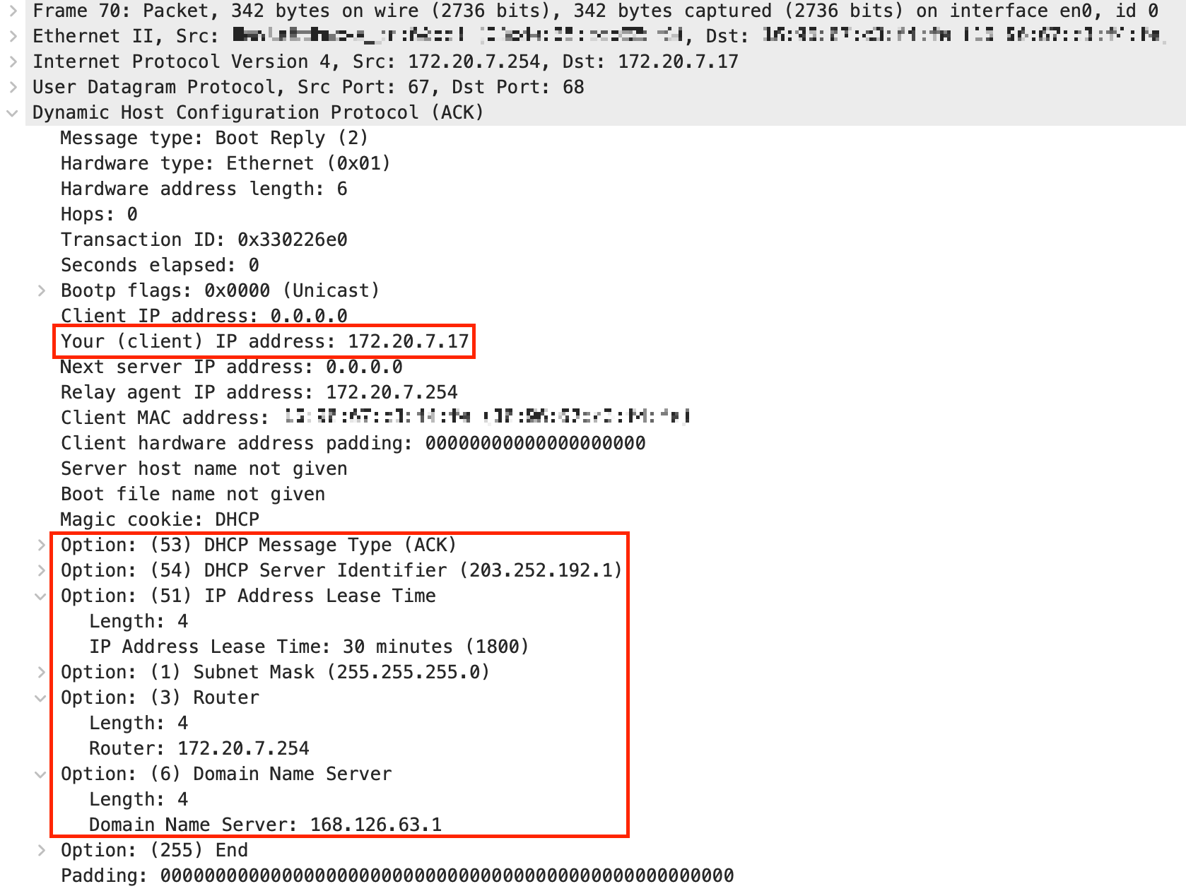 해당 패킷을 통해 DHCP 서버(203.252.192.1)가 클라이언트(XX:XX:XX:XX:XX:XX)에게 IP 주소 172.20.7.17을 30분 동안 임대함을 승인한 것을 확인할 수 있다.