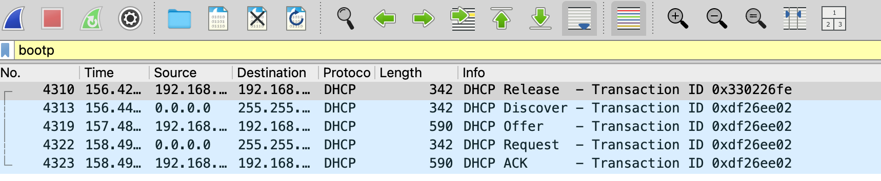 와이어샤크에서 DHCP Discover, Offer, Request, ACK 과정이 일어나는 것을 확인할 수 있다.