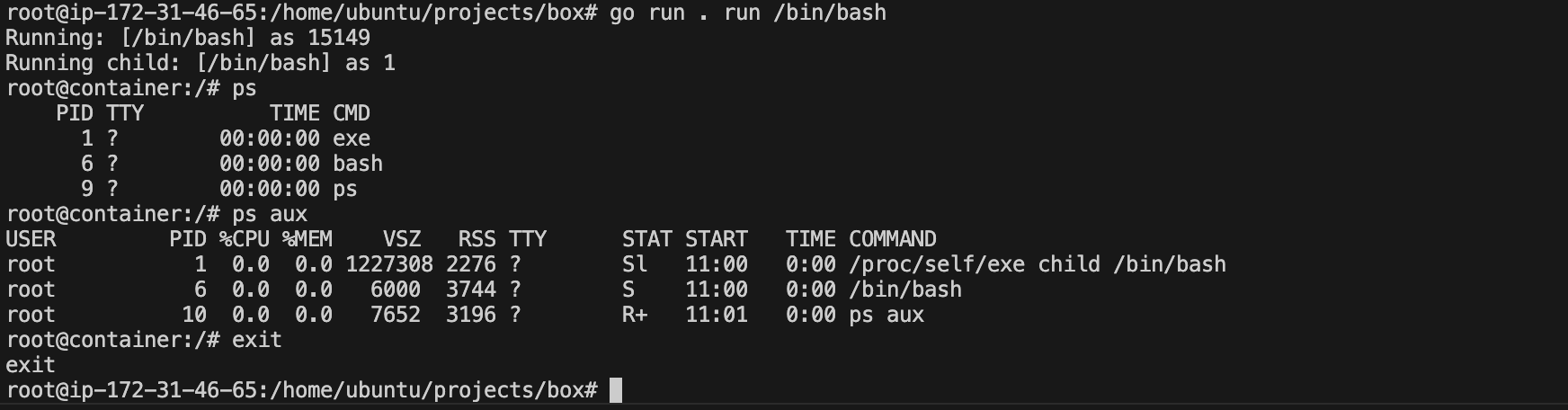 Cloneflags: syscall.CLONE_NEWUTS | syscall.CLONE_NEWPID | syscall.CLONE_NEWNS,를 통해 새로운 UTS, PID, Mount 네임스페이스를 생성했다. 따라서 이론적으로는 부모 프로세스와 격리되어야 한다.