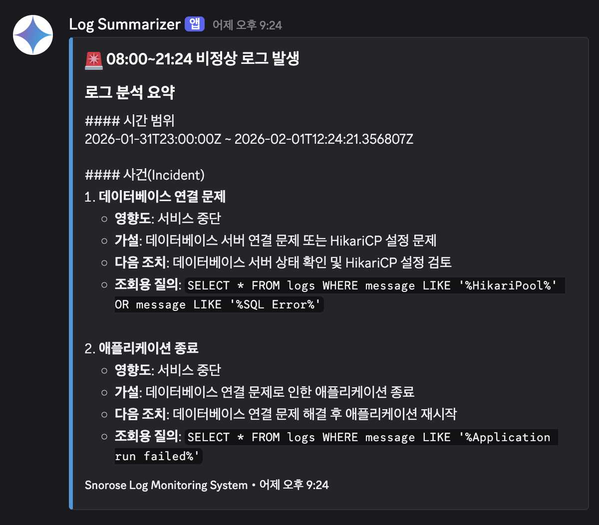 Discord와 같은 메신저로 결과를 받아볼 수 있으며, 개발자는 별도의 대시보드에 접속하지 않아도 주요 로그 이슈를 바로 확인할 수 있다.