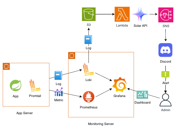 현재 구조에서는 Promtail + Loki + Grafana 조합을 사용하고 있지만, 핵심은 로그가 S3 또는 조회 가능한 저장소에 적재되어 있다는 것입니다.