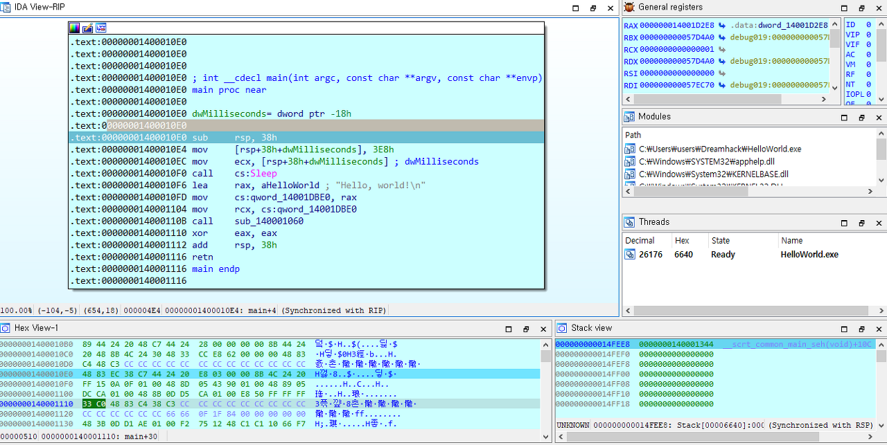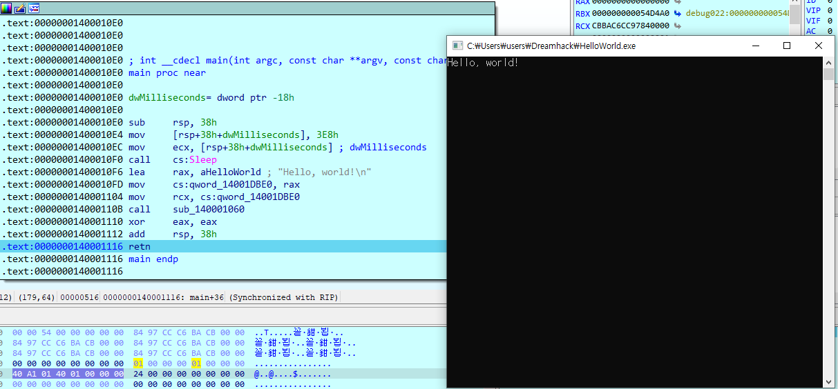 10. 프로그램을 확인하면, Hello, world!가 출력되어 있다. 정적 분석을 할 때는 함수의 기능을 추측하기 어려웠지만, 동적 분석으로는 문자열을 출력하는 함수라는 사실을 쉽게 알 수 있다.