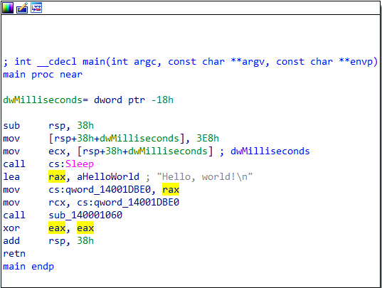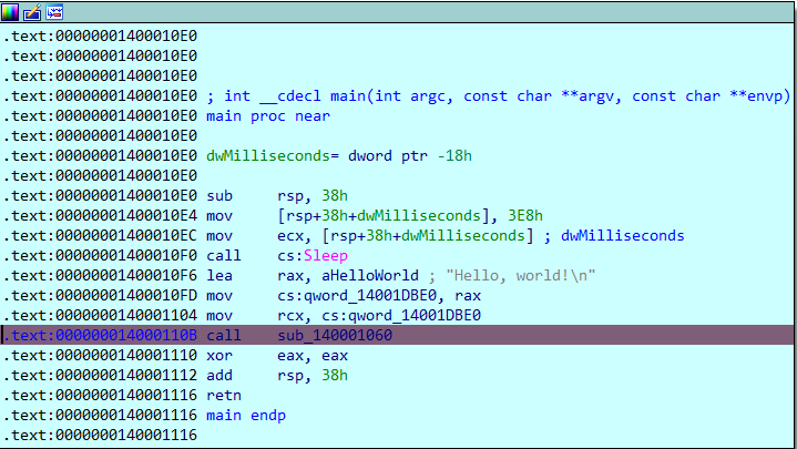 - sub_140001060에 “Hello, world!\n” 를 인자로 전달하여 호출한다.