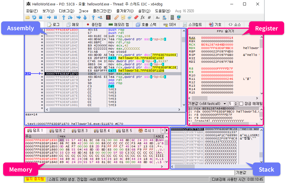왼쪽 위가 어셈블리, 왼쪽 아래가 메모리, 오른쪽 위가 레지스터, 오른쪽 아래가 스택의 정보를 보여준다.