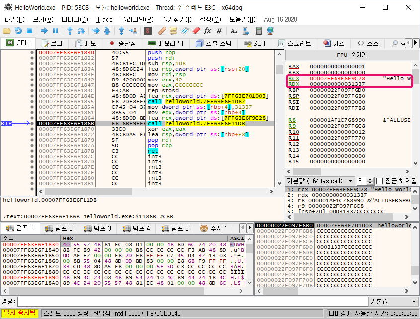이미지 오른쪽 위의 레지스터를 보면, rcx에 Hello World 0x%x\n문자열이, rdx에 0x31337이 저장된 것을 확인할 수 있다.