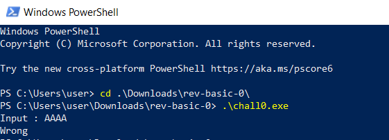 문제 파일의 압축을 해제한 후, 실행해보면 Input : 이라는 문자열이 출력된다. 출력된 문자열 뒤에 AAAA를 입력한 후, 엔터를 치면 Wrong이 출력된다. 문제가 사용자에게 문자를 입력받고 프로그램 내부의 어떤 검증과정을 거쳐 입력한 문자열이 검증을 통과했다면 Correct, 통과하지 못했다면 Wrong을 출력하는 방식으로 동작하는 것 같다.