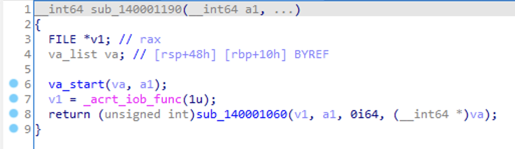 va_start 함수와 _acrt_iob_func(1); 함수가 사용되는 것으로 보아 앞서 Helloworld 실습에서 분석했던 것처럼 printf 함수임을 알 수 있다.