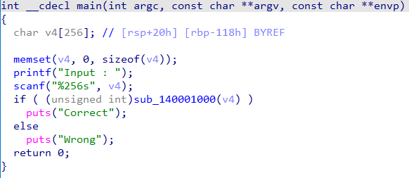 마지막으로 v4 배열을 sub_140001000 함수의 인자로 전달해 반환값이 있다면 “Correct”를, 아니라면 “Wrong” 문자열을 출력한다.
