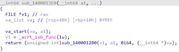 sub_1400012B0 함수 내부에서는 _stdio_common_vfprintf 함수를 호출한다.