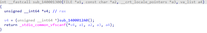 코드를 살펴보면, _stdio_common_vfscanf 함수를 호출하므로 sub_140001440 함수는 scanf 함수로 볼 수 있다.