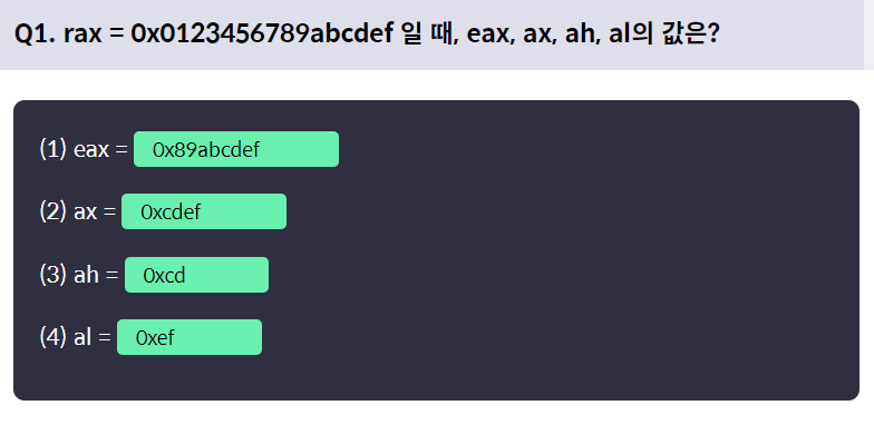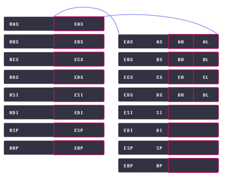 rax: 0x0123456789abcdef eax: 0x89abcdef ax : 0xcdef ah : 0xcd al : 0xef