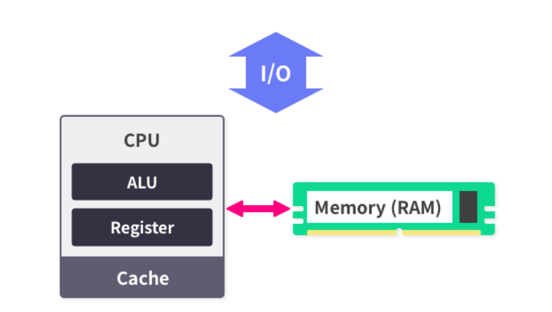 연산과 제어를 위해 중앙처리장치(CPU)를, 저장을 위해 기억장치(memory)를 사용하고 장치간에 데이터나 제어 신호를 교환할 수 있도록 버스(bus)라는 전자 통로를 사용하는 구조이다.