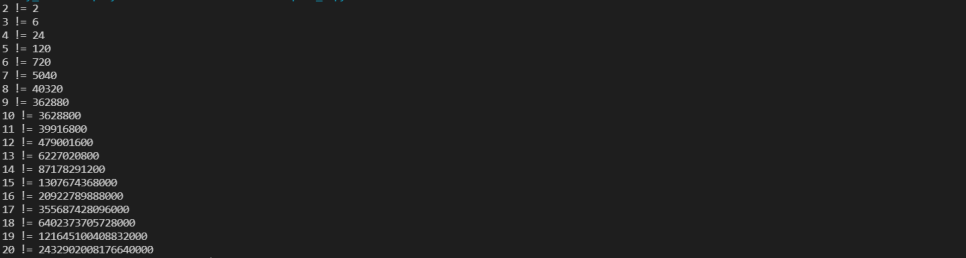 2부터 20까지 각 수의 팩토리얼(factorial)을 계산하는 프로그램을 작성해 보자.