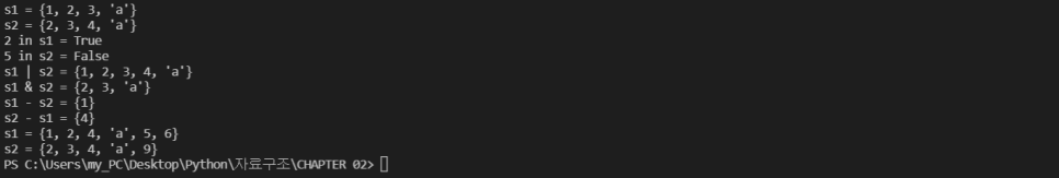 집합 자료형은 원소의 멤버십(in, not in)을 판단하거나 집합 연산으로 합집합(|), 교집합(&), 차집합(-)을 구하는데 유용하다.