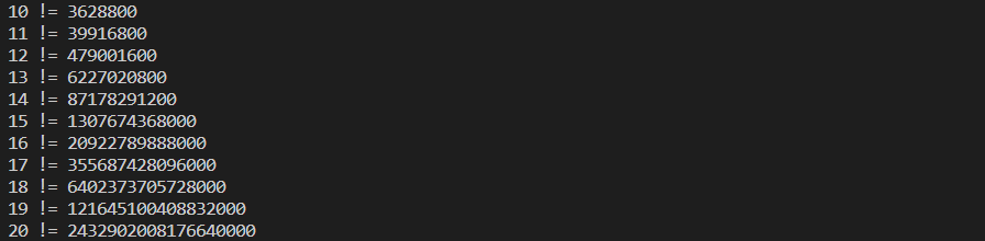 프로그램 3.1은 재귀 함수로 10 ~ 20까지의 팩토리얼을 각각 계산하는 프로그램이다.