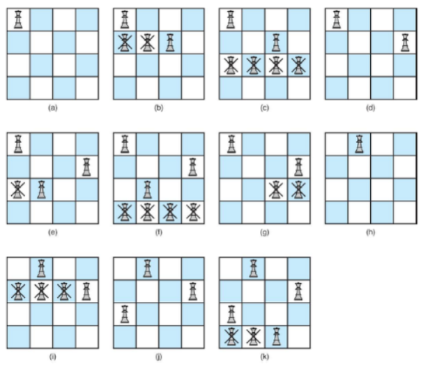 위의 사진은 4-Queens 문제의 해를 백트래킹 방법으로 찾는 과정이다.