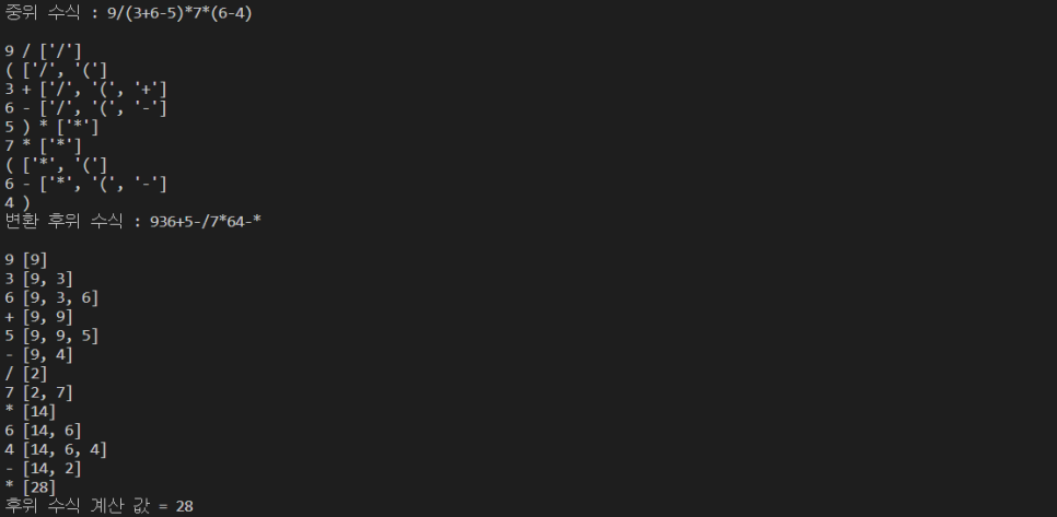 토큰을 전부 검사했다면 스택 안에는 결과값만이 있기 때문에 pop을 통해 이를 출력한다.