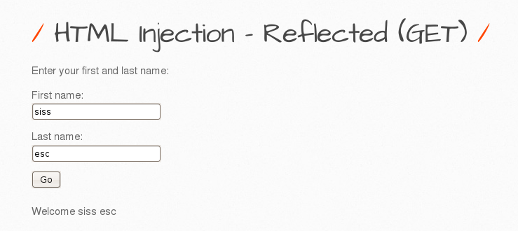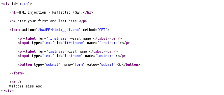 HTML Injection-Reflected(GET) 항목을 선택하면 나오는 htmli_get.php는 사용자가 입력한 값을 그대로 출력하는 페이지이다.