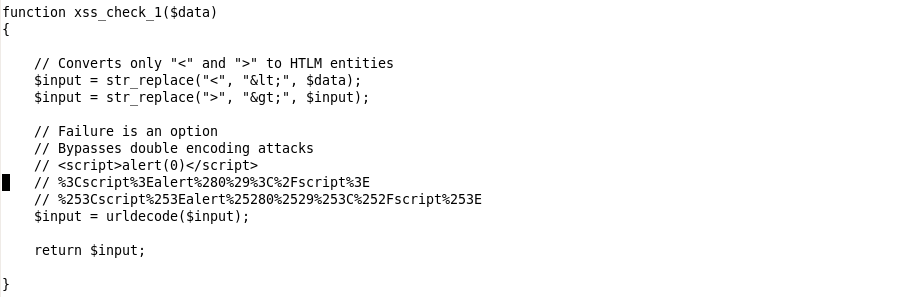보안 레벨이 1(medium)면 xss_check_1($data)는 "<"를 "<"로, ">"를 ">"로 변환한 뒤 디코딩을 통해 데이터를 출력하는 것을 확인할 수 있다.